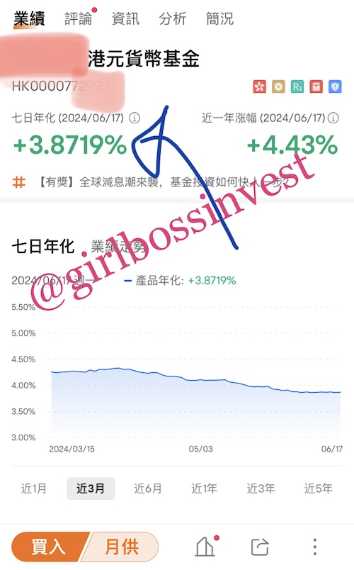 如圖示,此貨幣基金的7天年化收益率為3.879%。