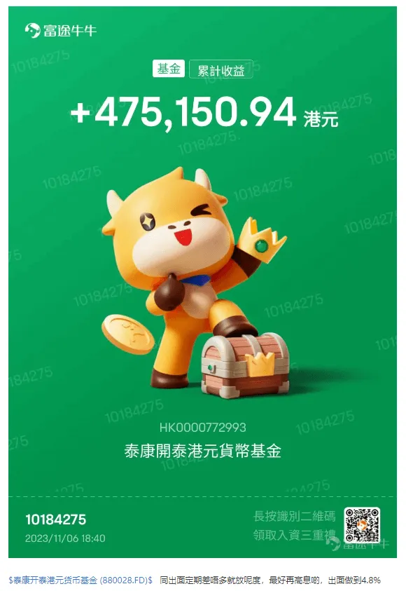 現金寶 Cash Plus是富途貨幣基金品牌的統稱,現金寶品牌底下的貨幣基金主要投資於政府短期債券、銀行定期存單等安全性較高的貨幣工具,適合保守型以上的投資者。根據富途牛牛官方資料,其服務過往一年100%正收益;$100以上可以認購,本金無上限。由於現金寶收益每日派發,財女把它歸類成「財女日日收息APP」的其中一款,方便觀眾明白富途牛牛APP有此收息功能。